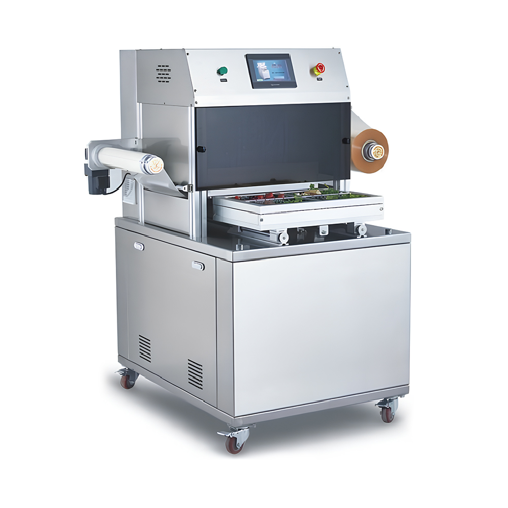 — это полуавтоматический напольный аппарат для герметичной упаковки пищевых продуктов в готовые лотки (контейнеры) из пластика или алюминия. Оборудование последовательно удаляет воздух из упаковки с помощью вакуумного насоса производительностью 63 м3/ч, затем замещает его инертным газом (азотом или смесью), после чего термосваривает многослойную плёнку и обрезает её точно по контуру лотка. Ширина рабочей плёнки - до 380 мм, высота лотка регулируется до 80 мм.