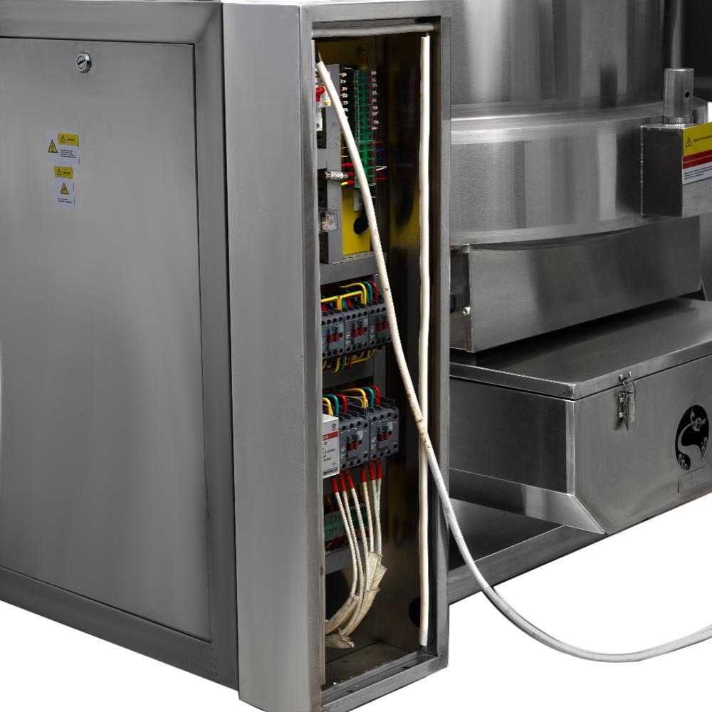 Система нагрева. Оба котла используют непрямой нагрев через двойную рубашку, заполненную высокотемпературным маслом класса вязкости 320. Это обеспечивает исключительно равномерное распределение тепла по всей поверхности дежи, предотвращает локальный перегрев и пригорание продукта. Нагрев осуществляется ТЭНами, погруженными в масляную рубашку.