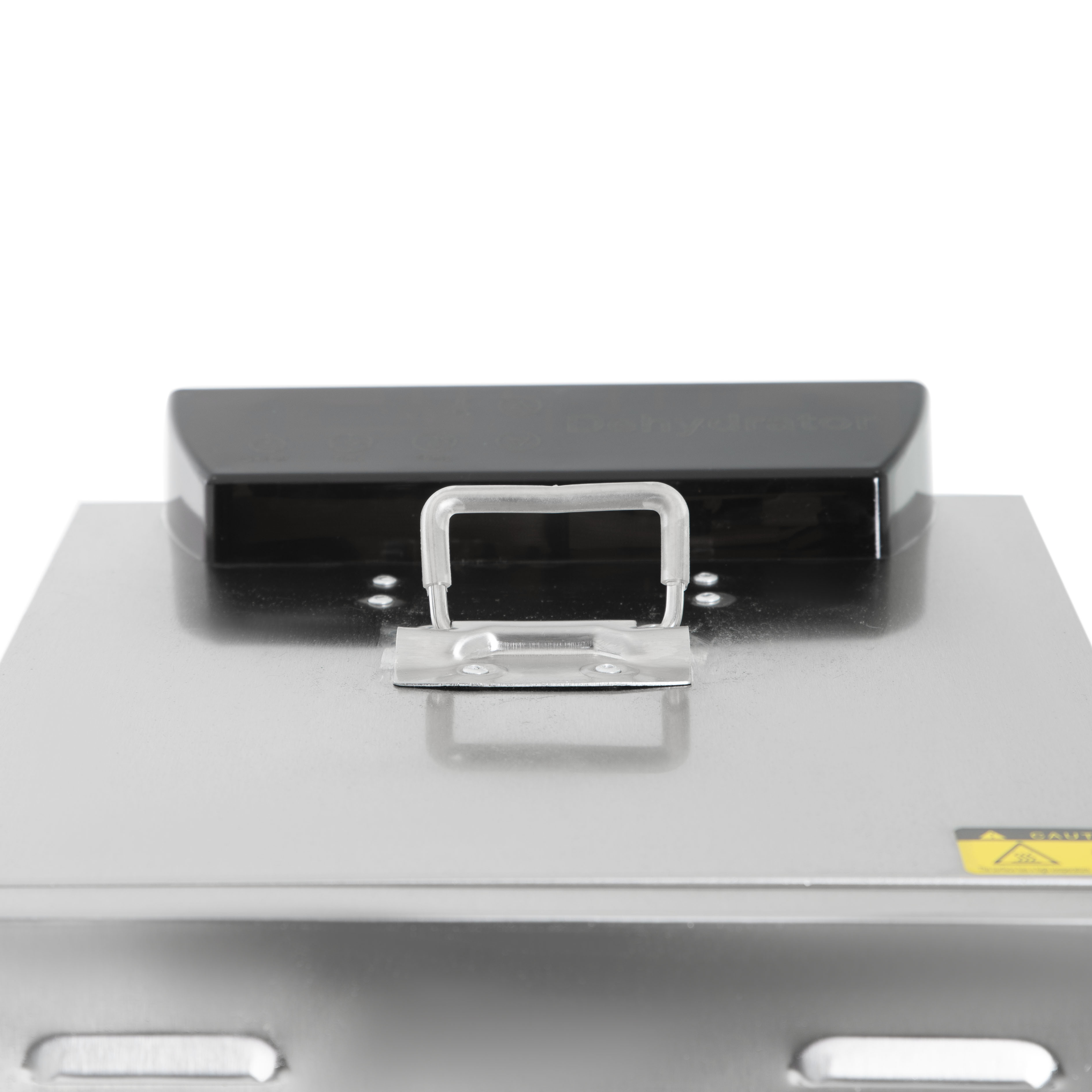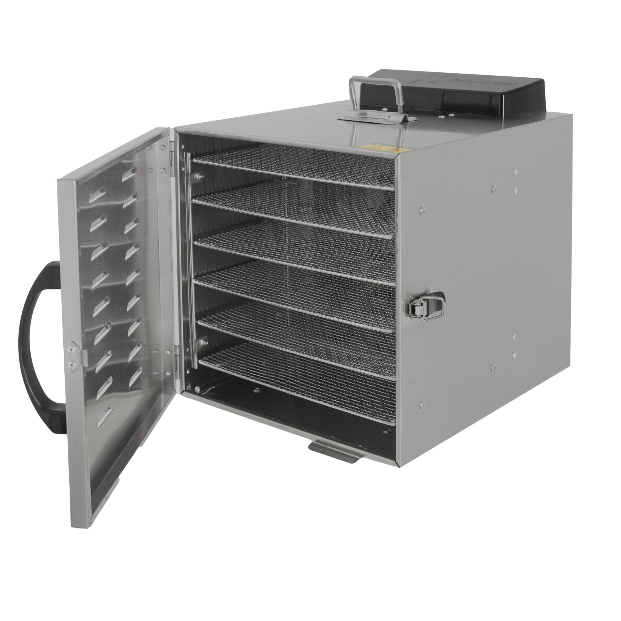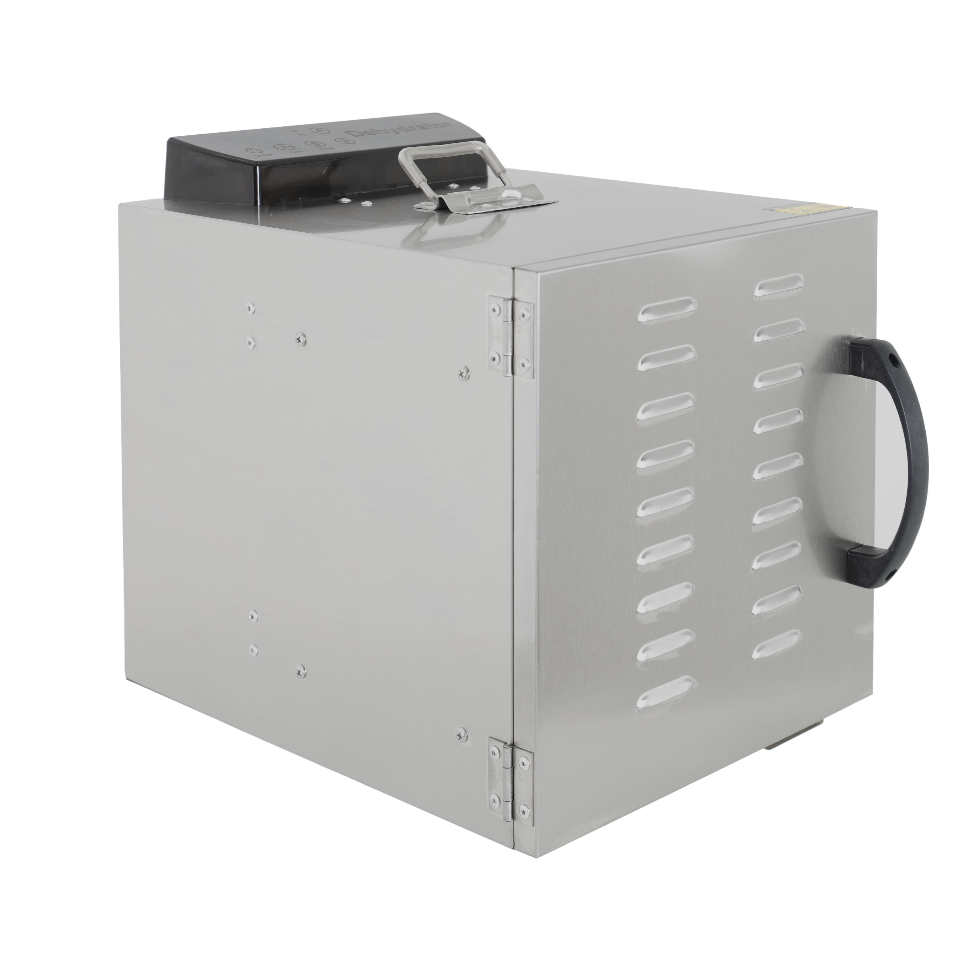 - Компактность и вместительность. Шесть уровней с противнями из нержавеющей стали (280х200 мм, сетка 7х7 мм) и увеличенным межполочным расстоянием (46 мм) позволяют одновременно обрабатывать большой объём сырья. Небольшие внешние размеры (557х300х335 мм) и вес 6,5 кг упрощают размещение и перемещение оборудования.