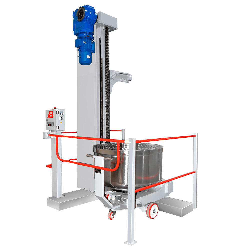 - Плавный подъем и точное позиционирование. Цепная передача обеспечивает плавное и контролируемое перемещение каретки по стойке. Это позволяет точно установить дежу на необходимой высоте для выгрузки теста в приемный бункер, минимизируя потери продукта.